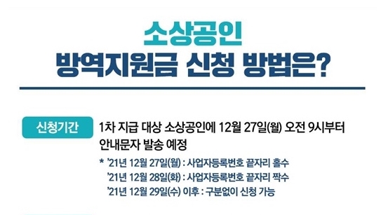 ㅇ 신청기간 : 1차 지급 대상 소상공인에게 12.27(월) 오전 9시부터 안내문자 발송 예정