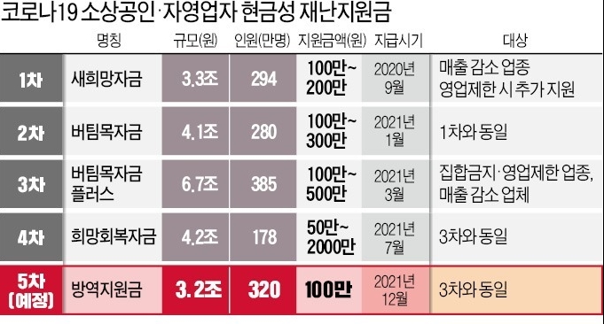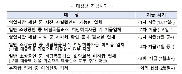 영업시간 제한을둔 소상공인은 오늘(12.27)부터 바로 지급이 시작. 이후 6차에 걸쳐 순차적으로 지급.