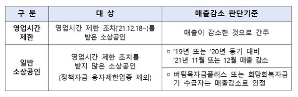 매출 감소 또는 감소가 예상되는 21.12.15일 이전에 개업한 소상공인.소기업 약 320만 개사에 지원