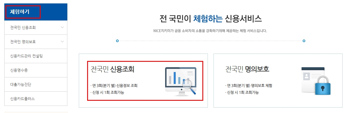 개인신용평점 확인하는 방법 : 아래 나이스 지킴이 이동하셔서 전국민 신용조회 이용하시면 신용평점을 확인하실수 있습니다. 기본적으로 나이스지키미이용은 유료이지만, 위에 그림처럼 사이트내에서 체험하기로 이동하신후, 전국민 신용조회 누르시면 분기별 1회 무료 이용 가능하니 무료이용 잘 활용하셔서 이용하시기 바랍니다.