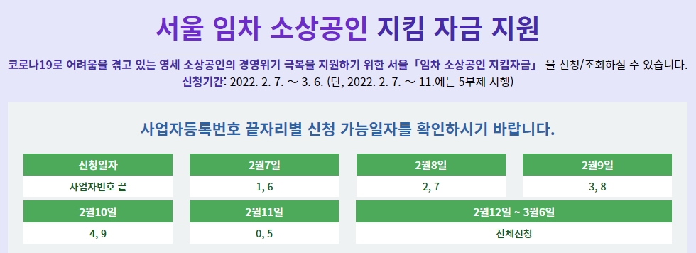 서울 임차 소상공인 지킴자금 지원 신청기간 : 2022.02.07 ~ 03.06(단. 첫주 5일 2.7~11에는 5부제 시행)