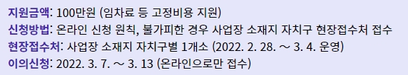 ** 여기서 말하는 임차 사업장이란 : 매월 임차료를 고정적으로 지출하면서 관리비 등을 부담하고 있는 소상공인을 말합니다(Ex. 전세는 지원불가, 무상임대 지원불가)