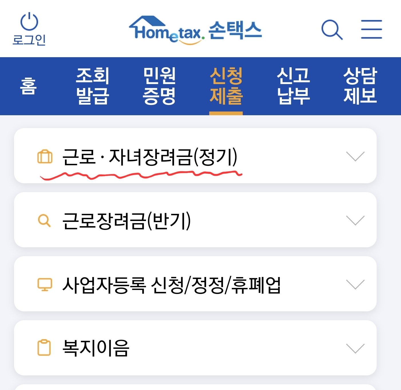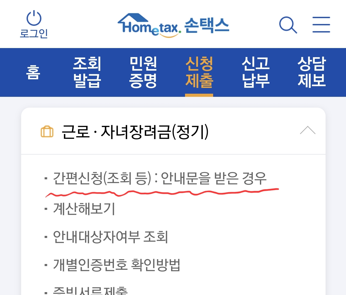 - 신청 안내 대상자가 국세청 홈택스에 로그인하여 [신청·제출 => 근로·자녀장려금 신청하기]에서 간편하게 신청