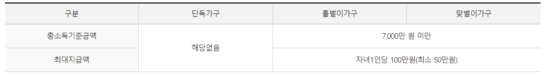 - 홑벌이가구 : 배우자 또는 부양자녀 또는 70세 이상 직계존속이 있는 가구(배우자 총 급여액 300만원 미만)