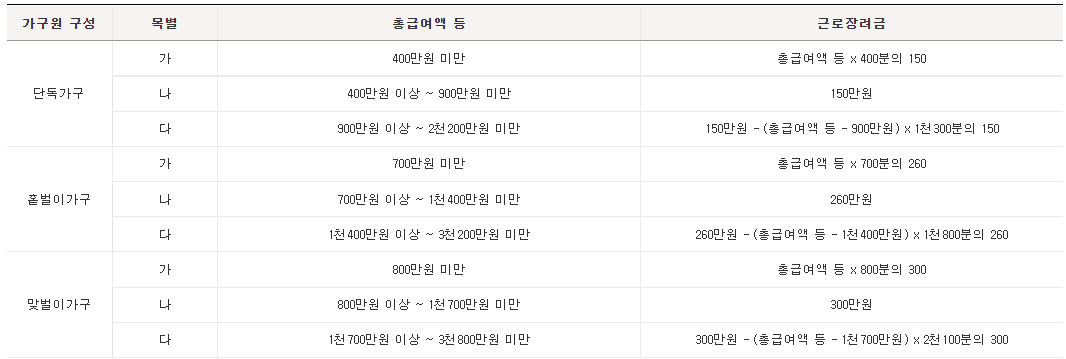 전년도 연간 부부합산 총급여액 등을 기준으로 다음의 산식을 반영한 근로장려금 산정표에 따라 계산.