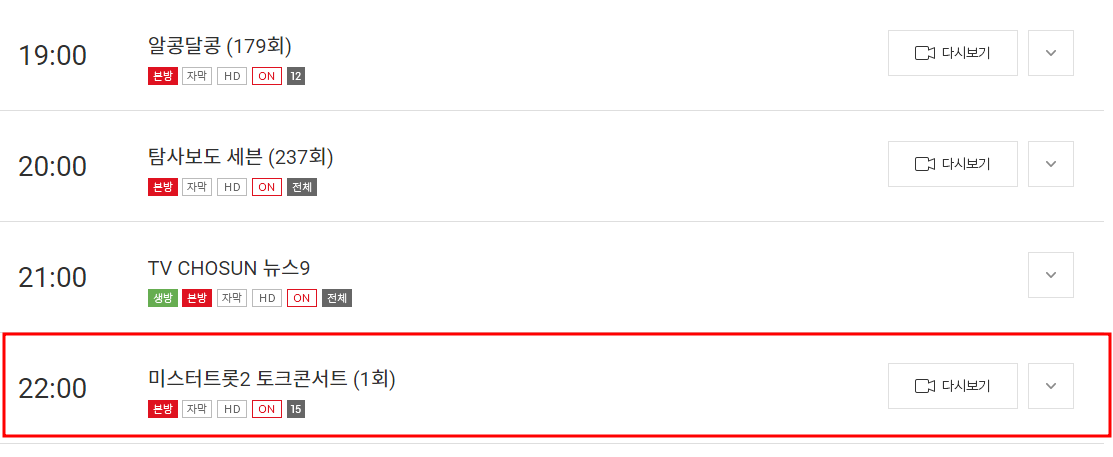 | 방송채널(실시간) | 티비조선 채널, TV조선 온에어, 티빙(TVING) |
