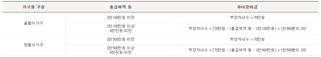 - 맞벌이 가구 : 신청인과 배우자 각각의 총 급여액 등이 300만원 이상인 가구(배우자 총 급여액 300만원 이상)