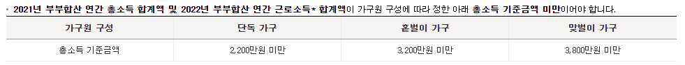 가구원 구성에 따라 연간 부부합산 총소득금액이 기준금액 미만이어야 합니다.