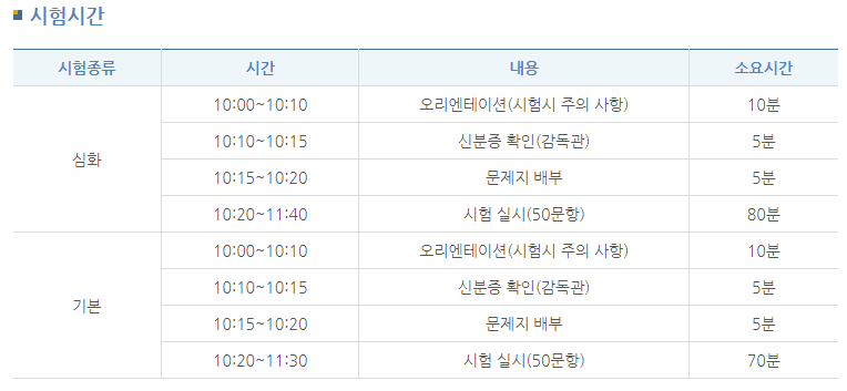 ㅇ 시험은 10시부터 오리엔테이션을 시작으로 실제 시험시간은 10시 20분부터 11시 30~40분까지 진행
